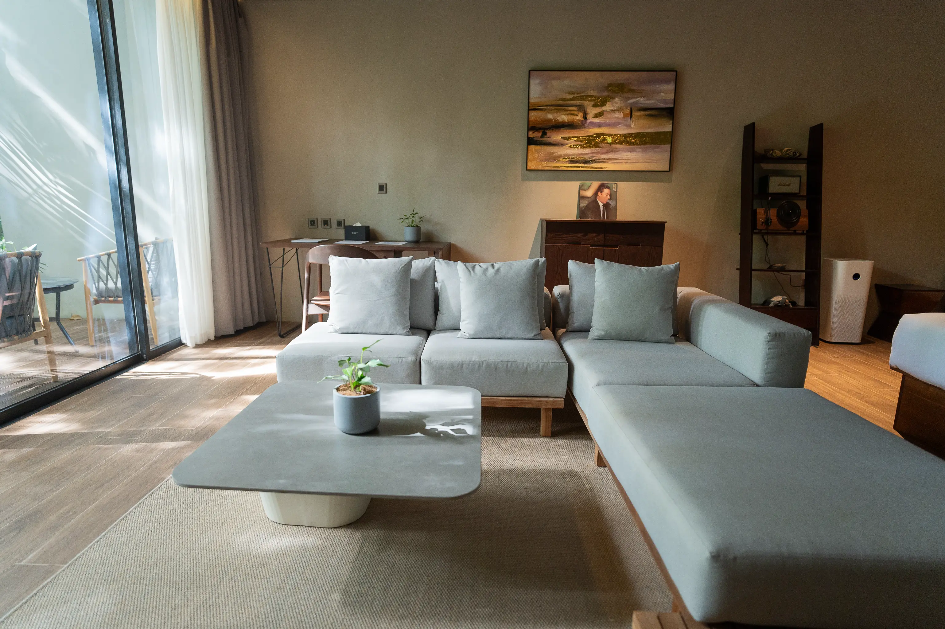 The Deluxe Studio with Garden provides an enhanced experience with expanded living space and elegant design. This room offers a tranquil garden view, blending luxury with nature for a memorable stay.